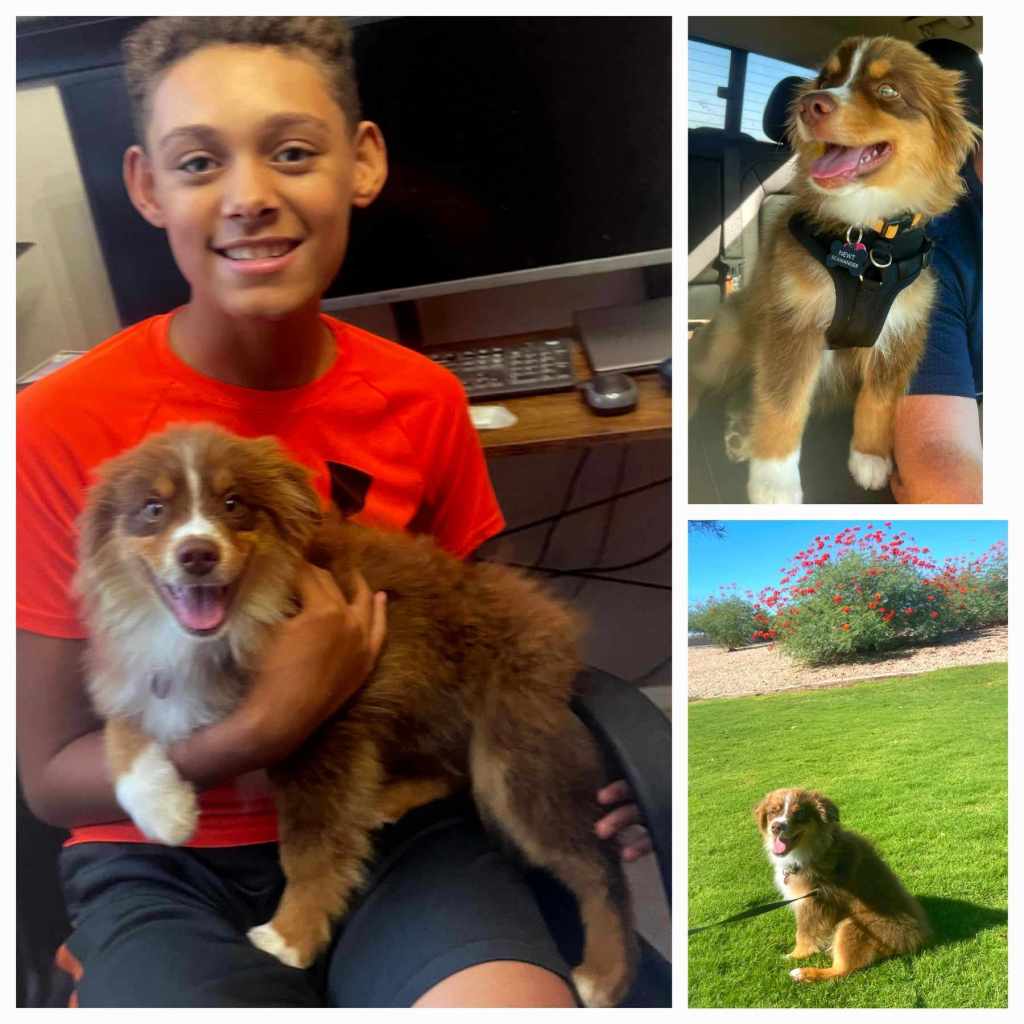 We are beyond pleased with our experience with Sheila with King’s Miniature American Shepherds! We had been searching for a puppy for over 6 months and when I saw Newt (formerly known as Chewy) I instantly fell in love with him! After reviewing the website, researching King’s MAS online, and viewing their social media accounts, I was extremely excited to contact them. I really enjoyed seeing all the pictures and videos posted on their website, facebook, & instagram. Seeing the atmosphere and environment that the puppy was being raised in was very important to us. Also, as soon as I saw the videos of Newt/Chewy I knew he was the one! We were extremely impressed with King’s MAS and decided to submit an application online. The next business day, I sent a text message to Sheila letting her know how extremely interested I was in Chewy. She told me that he was no longer available. Little did I know, my husband spoke with her before I did and they came up with the idea of surprising me! While I was at work my husband went to meet Sheila and Chewy. He said that he was very impressed with their professional horse ranch and told me how lovely their family was. I absolutely loved the surprise of coming home to the puppy of my dreams!