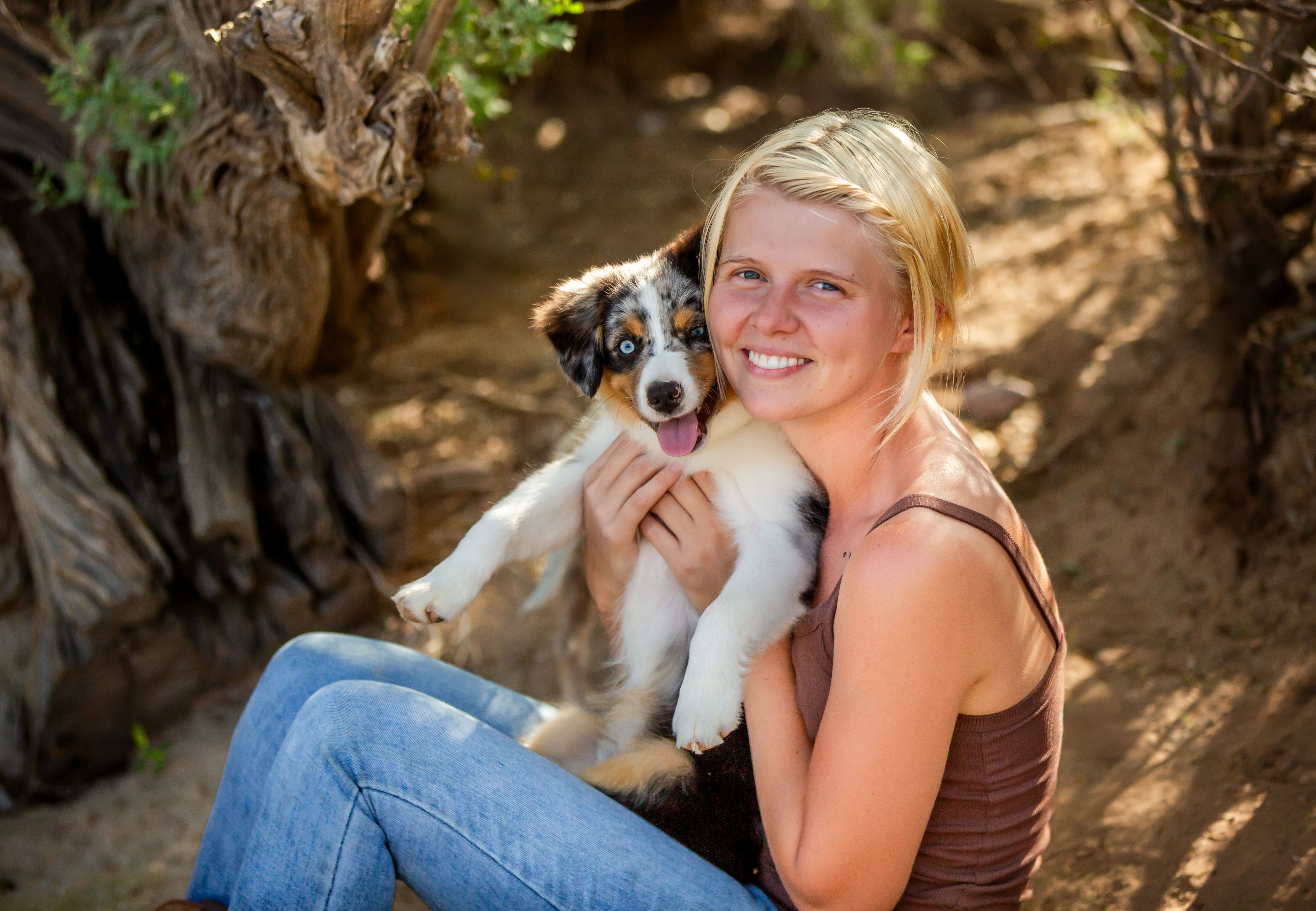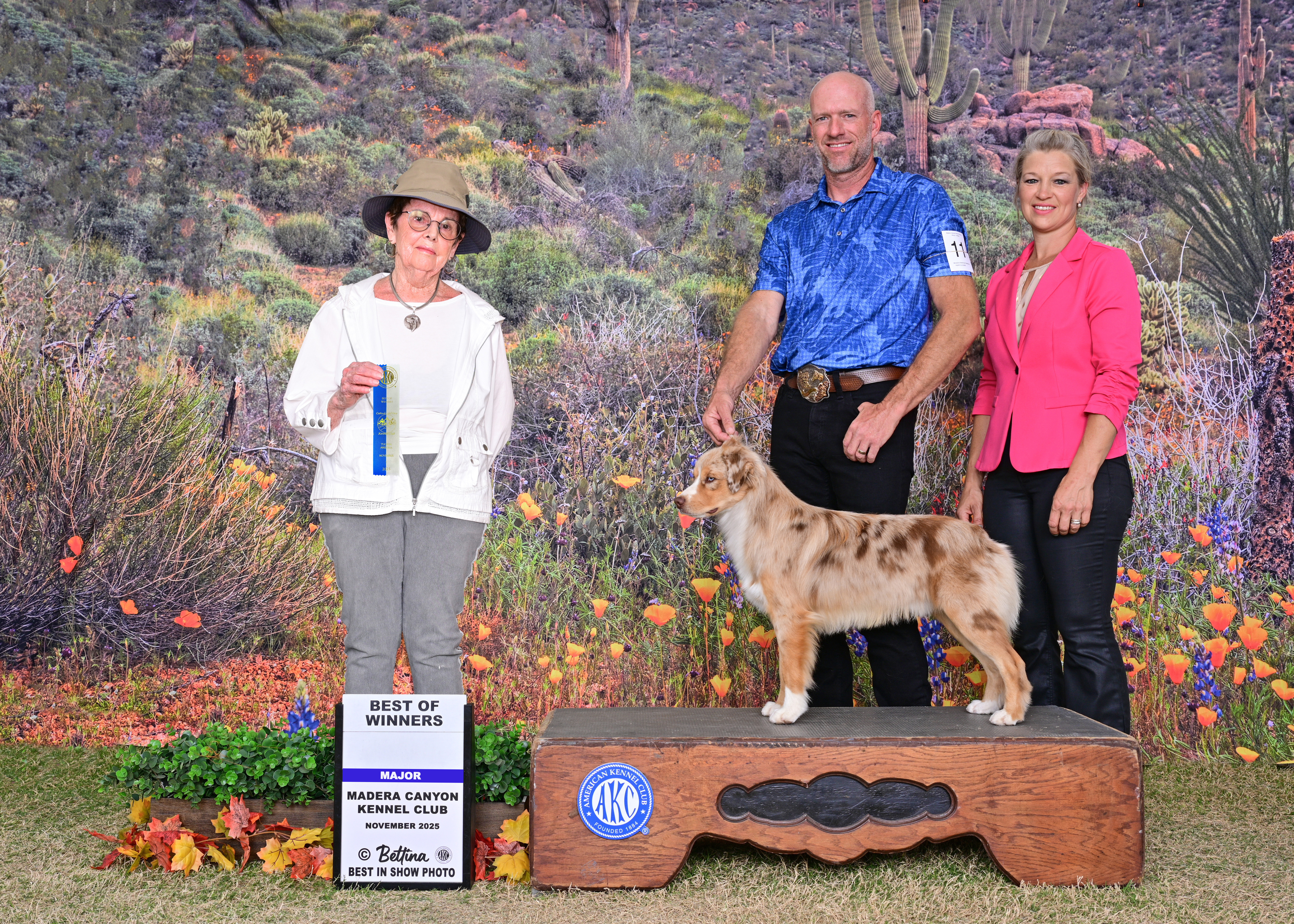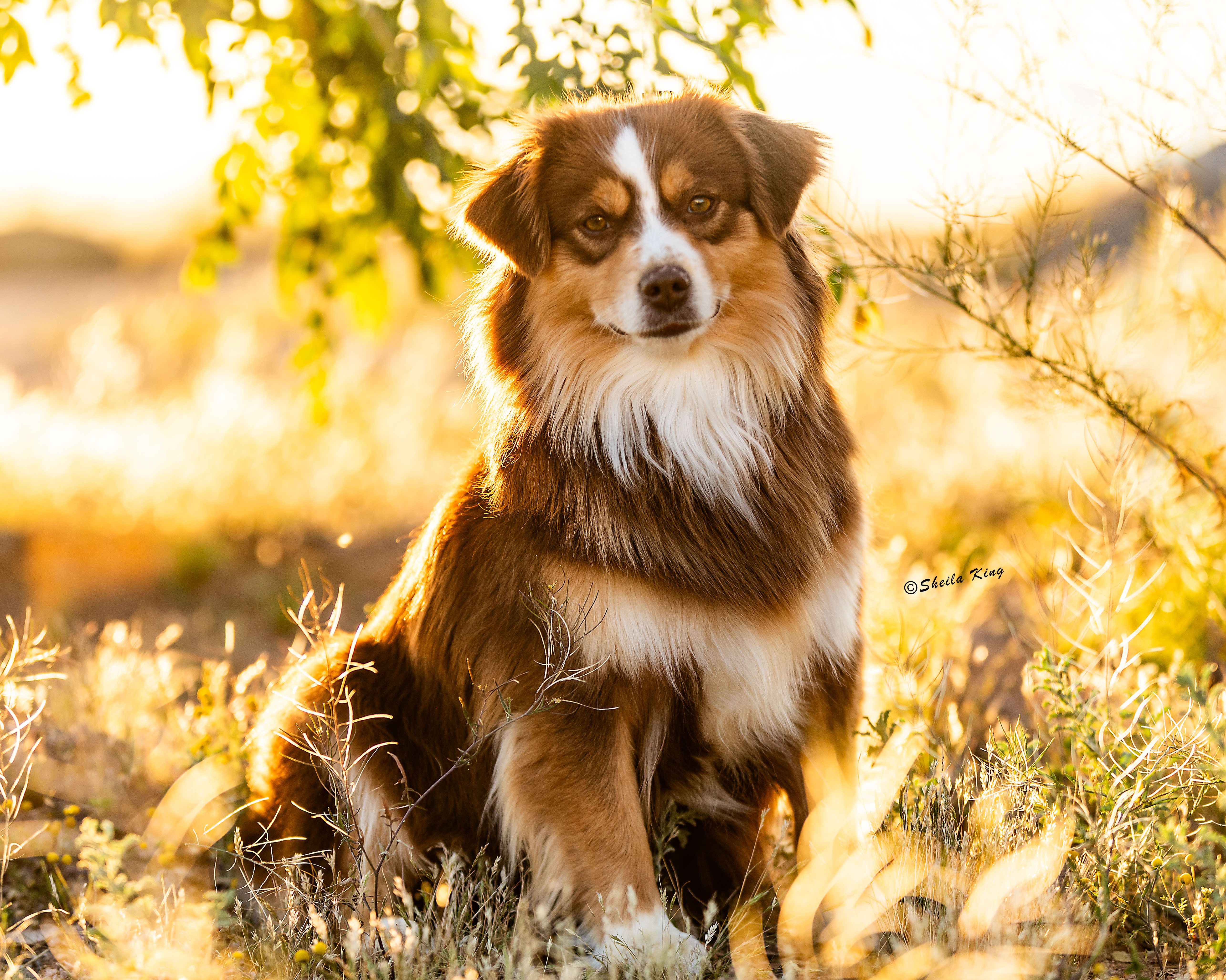 “I’d been looking for a puppy for about 6 months. I’d met plenty and none were perfect. We wanted a smart dog, easy disposition, not too big and also athletic. I so lucked out finding Sheila on the web. We emailed for about a month about her dogs and my desires. Then I managed to get to Arizona to meet some puppies. And, it was love. I brought Buddy home when he was about 10 weeks old. I believe Sheila and her family socialized him perfectly. He’s got the best disposition -happy to greet old people, young people, people in uniform, wheel chairs or bicycles. He loves every dog he meets. He’s been turn key in terms of training. If I can think it -he can learn it. So he weaves between my legs, he rolls over, crawls, spins and is completely dependable off leash. He loves to play hide and seek with his toys or with us. He’s a complete joy. Everyone who meets him wants to take him home. We cross country ski with him, hike in the mountains, fish and swim. He’s so easy -he’ll try anything. He weighs 35 pounds at one year and is a total joy. He loves to cuddle, he loves to run, he just wants to learn and please. We are so lucky to have found Sheila.”