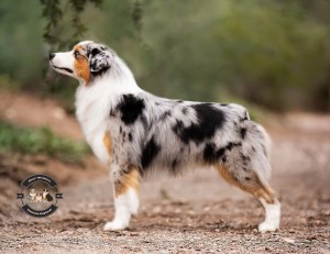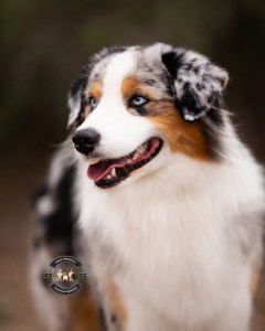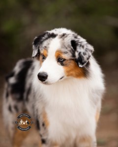 Don’t let his stout and strong stature fool you. He is quite the cuddle bug and thinks he is a lap dog. He has also sired champions in obedience, tracking, frisbee and tricks titles. Topaz is a beautiful blue merle with double blue eyes and gorgeous copper points. He has added a lot of bone and width to our puppies when bred to smaller females. He was our first stud and will always hold a special place in our hearts. He is loved by everyone who meets him. His the sire of Autumn and grandsire to our sweet boy Charlie!